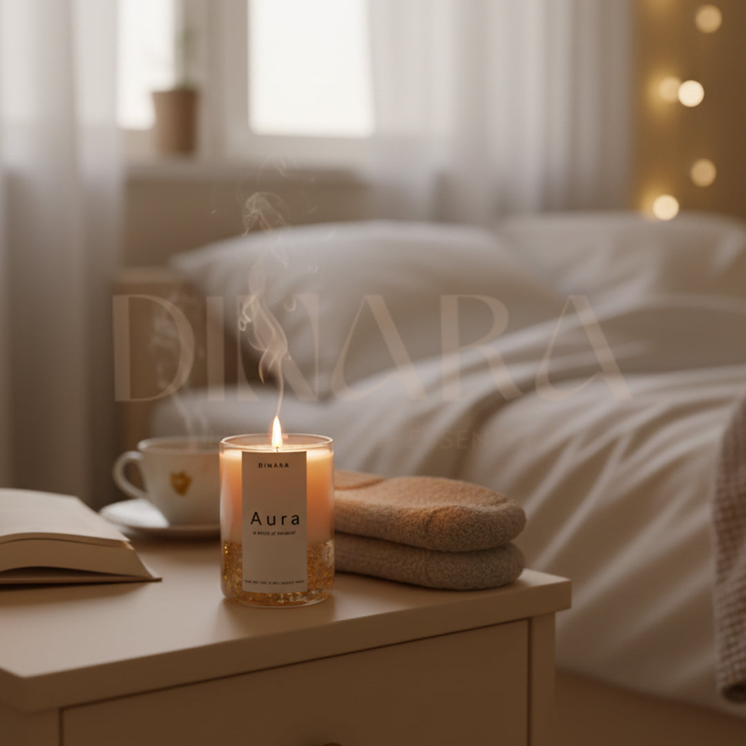 Elevate your senses with our Aura (mini) candle. Crafted with extreme hardwork, this mini candle boasts 90ml and 2 inch height, 1.5 inch diameter. A blend of gold flakes infused gel wax at the bottom and scented soy wax on top, it fills your home with a floral scent, evoking a refreshing spring garden.
