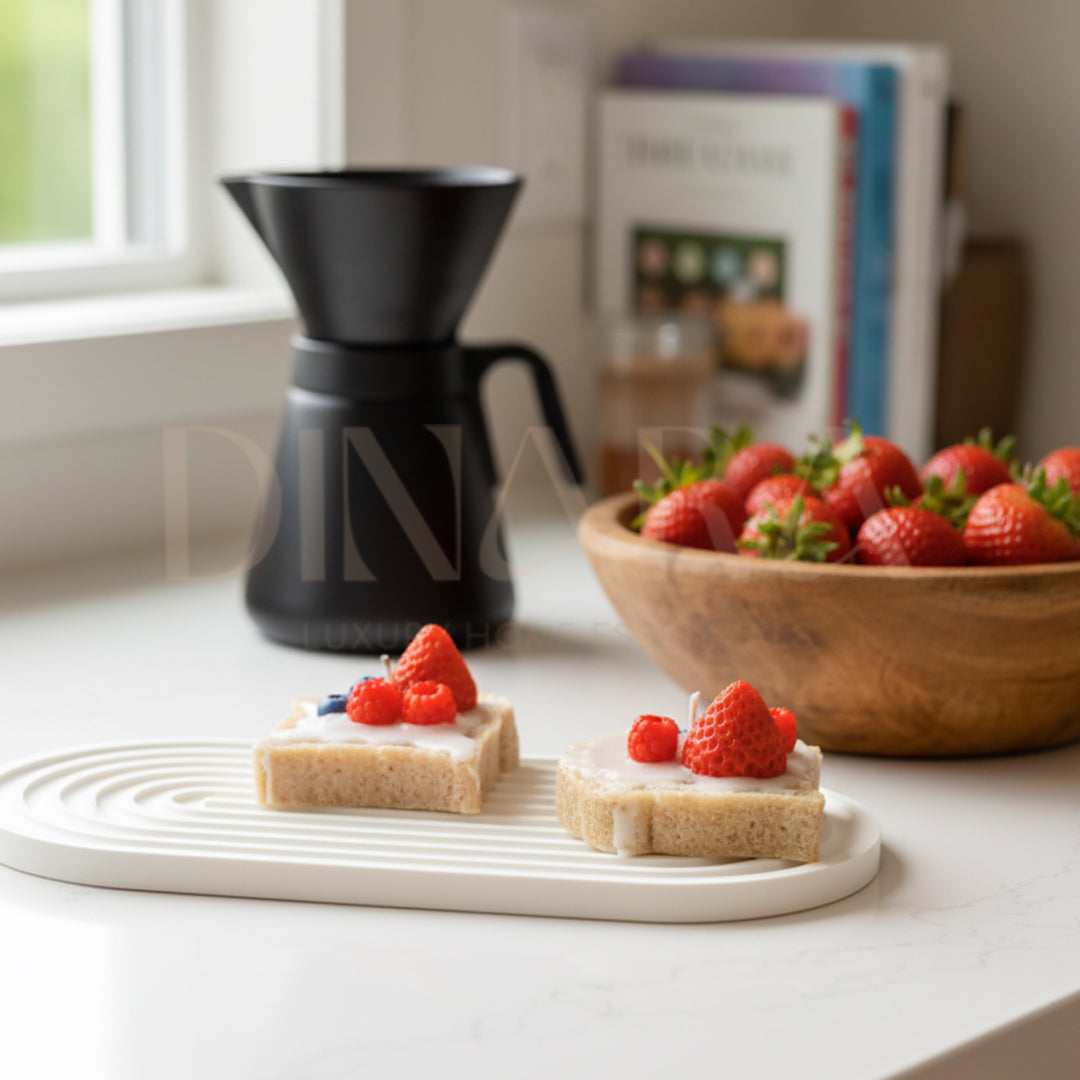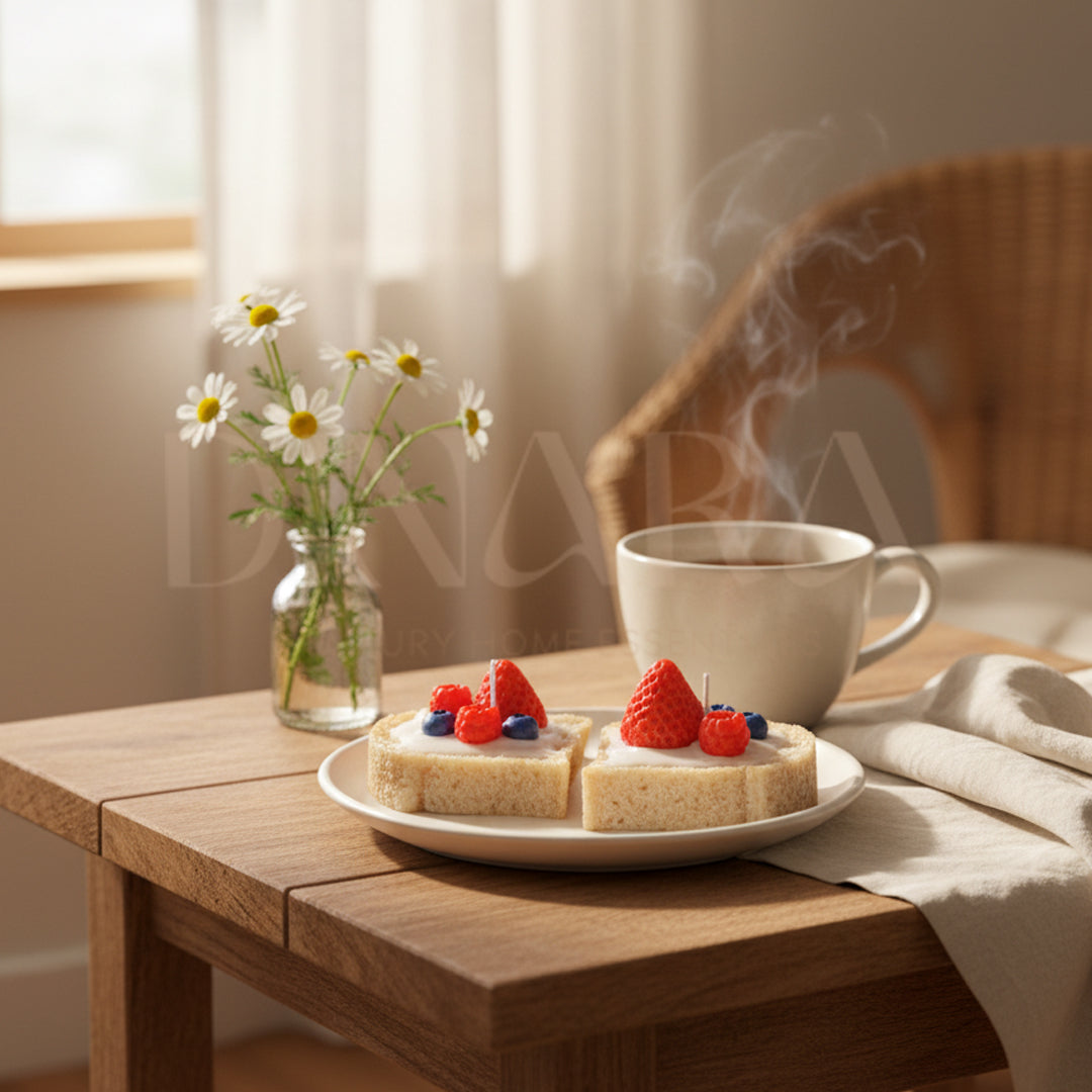 Our Berries frenchtoa"Indulge in our delectable Berries Frenchtoast - the fruit cake you can't eat, but can definitely light up any room! Measuring 8 cm in length and 3 cm in height, it's adorned with juicy strawberries, blueberries, and raspberries. Looks so realistic, you'll want to take a bite! (But please don't, it's fake!)"
