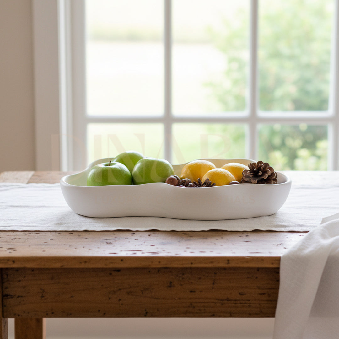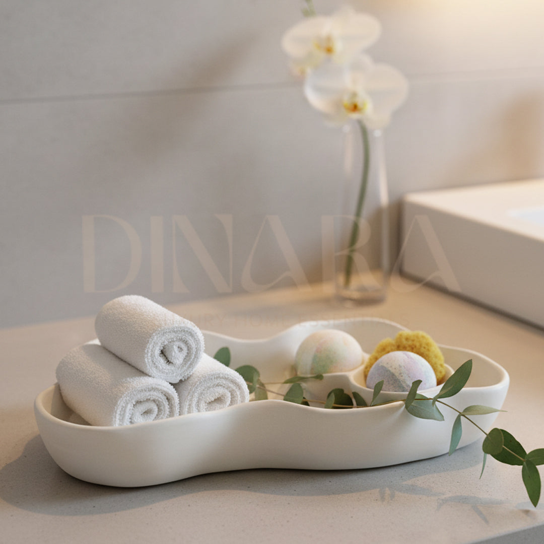 "Indulge in the beauty and functionality of our Nile Tray, inspired by the majestic River Nile. Crafted with pure white cement, this 11.46 inch tall and 5.5 inch wide tray is perfect for storing your decor, soaps, candles and more. Bring a touch of elegance and organization to any space with the Nile Tray!"