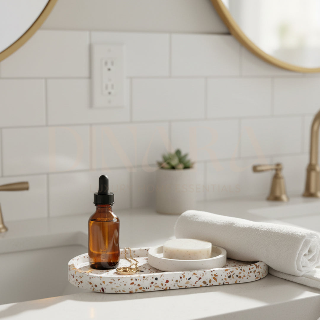 This 7 inch by 4 inch Terrazzo oval trinket tray will make a great addition to your home décor. Not only does it provide an eye-catching display for your favourite items, but its spacious size of 7" x 4" is perfect for organizing small items and keeping countertops clutter-free.