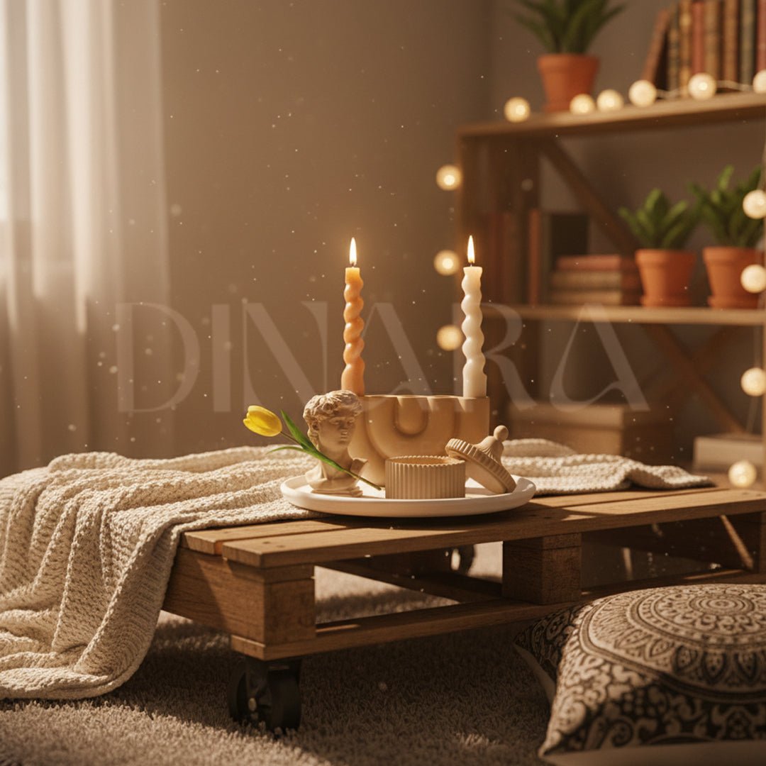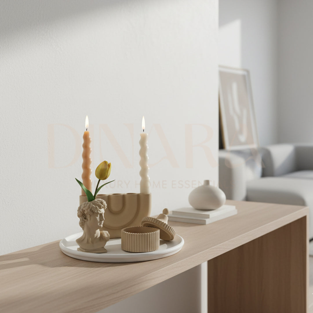 Experience the perfect blend of earth's sand with Ravak. This exceptional deal features a beige David vase, a candle holder with two spiral candles, a large ceramic tray, and a ceramic jewellery container in neutral tones. Embrace the natural beauty of Ravak.