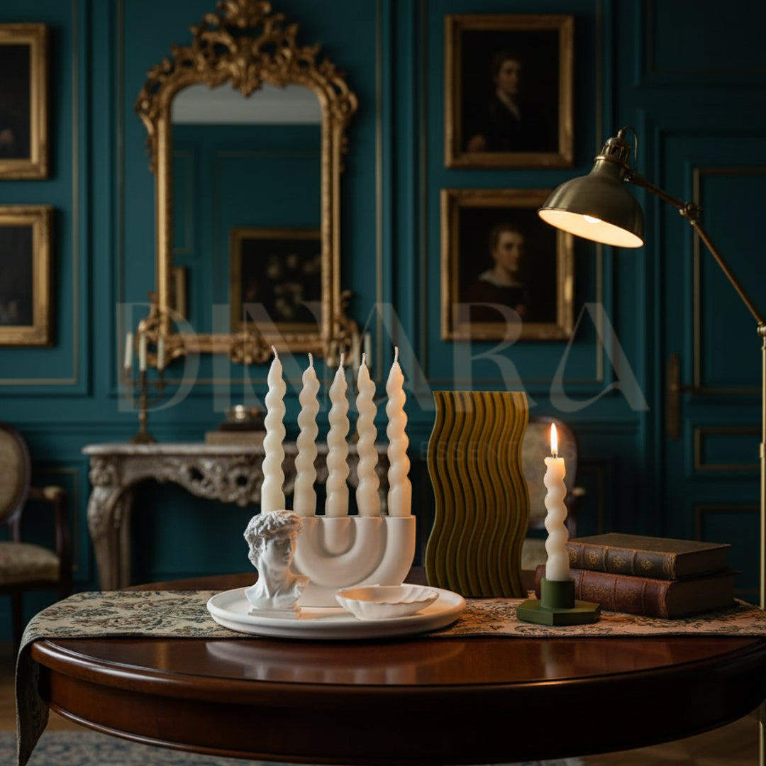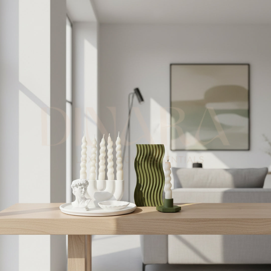 Experience luxury and elegance with our "Thorn" deal, featuring our signature "Sol" candle holder, 6 spiral candles, and a collection of stunning home decor pieces including a david vase, shell tray, hexagonal candle holder, large ceramic tray, and olive green wave tray. Elevate your space with this perfect blend of ancient art.